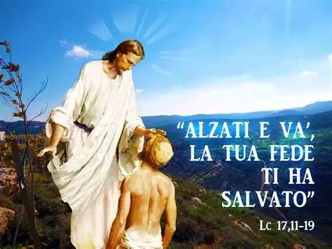 Lungo il cammino verso Gerusalemme, Gesù attraversava la Samarìa e la Galilea. Entrando in un villaggio, gli vennero incontro dieci lebbrosi, che si fermarono a distanza e dissero ad alta voce: «Gesù, maestro, abbi pietà di noi!». Appena li vide, Gesù disse loro: «Andate a presentarvi ai sacerdoti». E mentre essi andavano, furono purificati. Uno di loro, vedendosi guarito, tornò indietro lodando Dio a gran voce, e si prostrò davanti a Gesù, ai suoi piedi, per ringraziarlo. Era un Samaritano. Ma Gesù osservò: «Non ne sono stati purificati dieci? E gli altri nove dove sono? Non si è trovato nessuno che tornasse indietro a rendere gloria a Dio, all’infuori di questo straniero?». E gli disse: «Àlzati e va’; la tua fede ti ha salvato!».