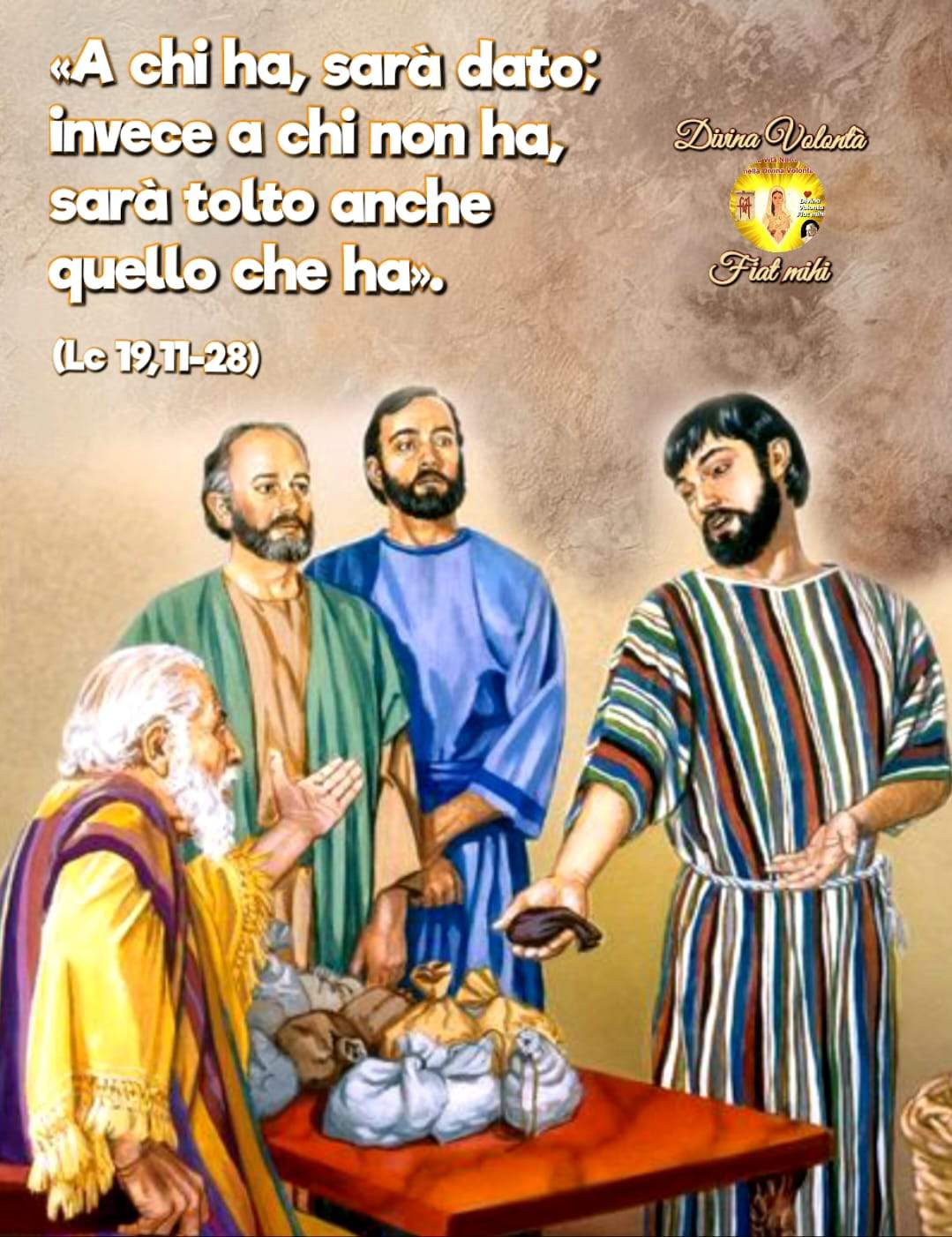 In quel tempo, Gesù disse una parabola perché era vicino a Gerusalemme e i discepoli credevano che il regno di Dio dovesse manifestarsi da un momento all’altro. Disse dunque: “Un uomo di nobile stirpe partì per un paese lontano per ricevere un titolo regale e poi ritornare. Chiamati dieci servi, consegnò loro dieci mine, dicendo: Impiegatele fino al mio ritorno. Ma i suoi cittadini lo odiavano e gli mandarono dietro un’ambasceria a dire: Non vogliamo che costui venga a regnare su di noi. Quando fu di ritorno, dopo aver ottenuto il titolo di re, fece chiamare i servi ai quali aveva consegnato il denaro, per vedere quanto ciascuno avesse guadagnato. Si presentò il primo e disse: Signore, la tua mina ha fruttato altre dieci mine. Gli disse: Bene, bravo servitore; poiché ti sei mostrato fedele nel poco, ricevi il potere sopra dieci città. Poi si presentò il secondo e disse: La tua mina, signore, ha fruttato altre cinque mine. A questo disse: Sarai tu pure a capo di cinque città. Venne poi anche l’altro e disse: Signore, ecco la tua mina, che ho tenuto riposta in un fazzoletto; avevo paura di te che sei un uomo severo e prendi quello che non hai messo in deposito, mieti quello che non hai seminato. Gli rispose: Dalle tue stesse parole ti giudico, servo malvagio! Sapevi che sono un uomo severo, che prendo quello che non ho messo in deposito e mieto quello che non ho seminato: perché allora non hai consegnato il mio denaro a una banca? Al mio ritorno l’avrei riscosso con gli interessi. Disse poi ai presenti: Toglietegli la mina e datela a colui che ne ha dieci. Gli risposero: Signore, ha già dieci mine! Vi dico: A chiunque ha sarà dato; ma a chi non ha sarà tolto anche quello che ha. E quei miei nemici che non volevano che diventassi loro re, conduceteli qui e uccideteli davanti a me”. Dette queste cose, Gesù proseguì avanti agli altri salendo verso Gerusalemme.