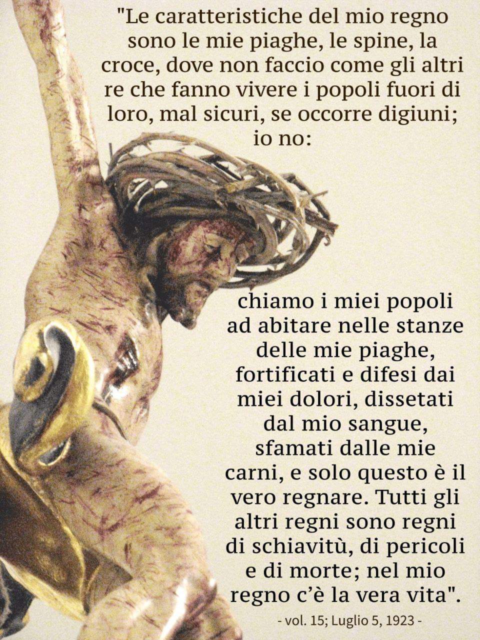 «Gesù Nazzareno Re dei Giudei»: una scritta prima posta sul legno della croce, poi più significativamente nel cuore dei fedeli. La regalità di Cristo trae la sua prima origine dalla stessa incarnazione. Egli assumendo la nostra natura umana, diventava non solo primogenito dal Padre, ma anche nostro primogenito nell’ordine della grazia. Il suo trono però dopo la culla di Betlemme, è la croce, quel legno che l’uccide, ma che è la nostra salvezza, che esprime il massimo dell’amore con il dono della vita. Quanto è diversa la regalità di Cristo da quella degli uomini! Sul suo trono viene deriso e oltraggiato: «Il popolo stava a vedere, i capi invece lo schernivano dicendo: «Ha salvato gli altri, salvi se stesso, se è il Cristo di Dio, il suo eletto». Ci resta difficile, se non sorretti dalla fede, comprendere come in quell’apparente immobilismo, in quell’esplicito e volontario rifiuto di usare per sè la potenza che aveva usata a favore di altri, sta la vera grandezza del nostro Re. Perché sta compiendo fino in fondo l’opera del Padre suo, perché egli nella sua misericordia può garantire il paradiso al buon ladrone, egli ci rivela la sua vera divina grandezza, la sua Regalità e la sua Signoria. Quell’umile preghiera: «Gesù, ricordati di me quando entrerai nel tuo regno», quella immediata risposta: «In verità ti dico, oggi sarai con me nel paradiso», fanno di noi i sudditi grati e devoti del grande Re.