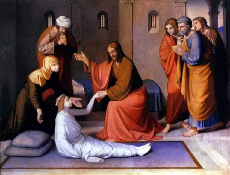 In quel tempo, essendo passato di nuovo Gesù all’altra riva, gli si radunò attorno molta folla… Si recò da lui uno dei capi della sinagoga, di nome Giàiro, il quale, vedutolo, gli si gettò ai piedi e lo pregava con insistenza: “La mia figlioletta è agli estremi; vieni a imporle le mani perché sia guarita e viva”. Gesù andò con lui. Or una donna, che da dodici anni era affetta da emorragia… udito parlare di Gesù, venne tra la folla, alle sue spalle, e gli toccò il mantello. Diceva infatti: “Se riuscirò anche solo a toccare il suo mantello, sarò guarita”. E all’istante le si fermò il flusso di sangue… Gesù rispose: “Figlia, la tua fede ti ha salvata. Va’ in pace e sii guarita dal tuo male”. Mentre ancora parlava, dalla casa del capo della sinagoga vennero a dirgli: “Tua figlia è morta. Perché disturbi ancora il Maestro?”. Ma Gesù, udito quanto dicevano, disse al capo della sinagoga: “Non temere, continua solo ad aver fede!”… Giunsero alla casa… Presa la mano della bambina, le disse: “Talità kum”, che significa: “Fanciulla, io ti dico, alzati!”. Subito la fanciulla si alzò e si mise a camminare.