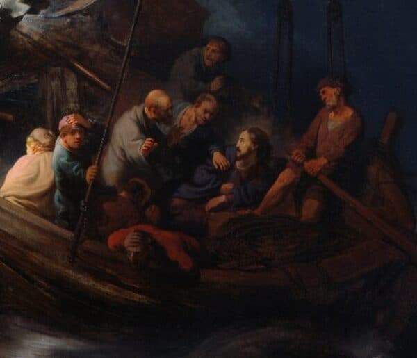 In quel giorno, verso sera, Gesù disse ai suoi discepoli: “Passiamo all’altra riva”. E lasciata la folla, lo presero con sé, così com’era, nella barca. C’erano anche altre barche con lui. Nel frattempo si sollevò una gran tempesta di vento e gettava le onde nella barca, tanto che ormai era piena. Egli se ne stava a poppa, sul cuscino, e dormiva. Allora lo svegliarono e gli dissero: “Maestro, non t’importa che moriamo?”. Destatosi, sgridò il vento e disse al mare: “Taci, calmati!”. Il vento cessò e vi fu grande bonaccia. Poi disse loro: “Perché siete così paurosi? Non avete ancora fede?”. E furono presi da grande timore e si dicevano l’un l’altro: “Chi è dunque costui, al quale anche il vento e il mare obbediscono?”.